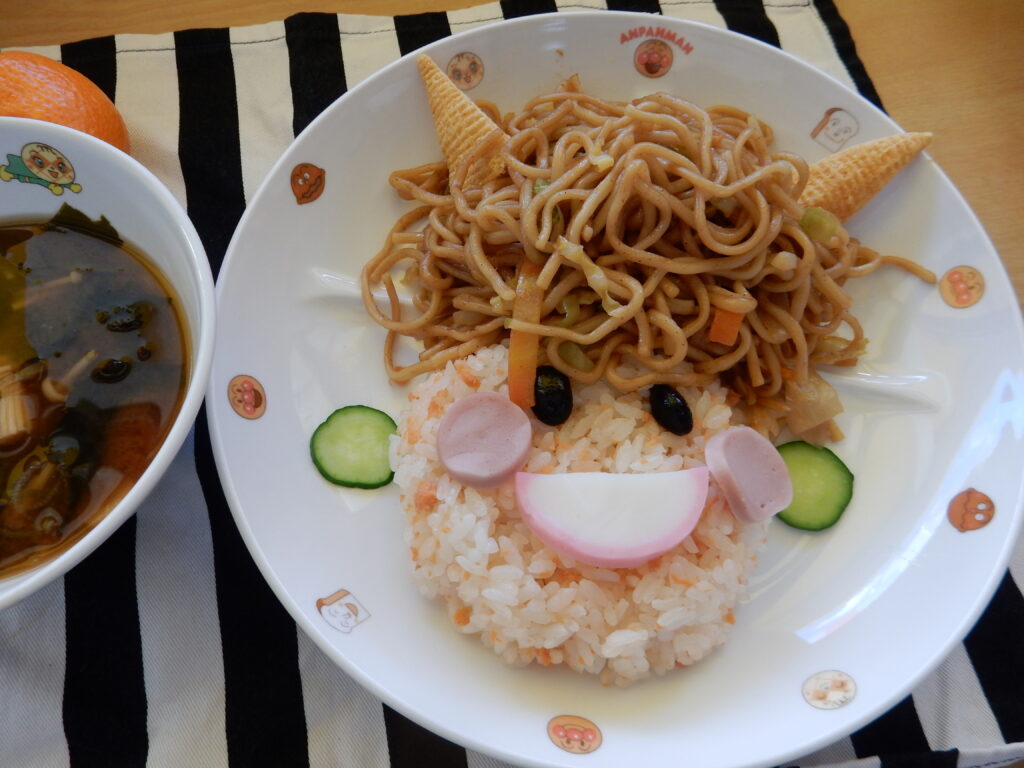 極楽保育園には、赤鬼さんと緑鬼さんが登場。朝からちょっぴり緊張気味だった子ども達でしたが、鬼が来ると元気に「おにはそと!ふくわうち!」と大きな掛け声に合わせて、豆をまく事ができました。給食は鬼の顔をした“節分ランチ”です。福の神がたくさん来てくれますように。